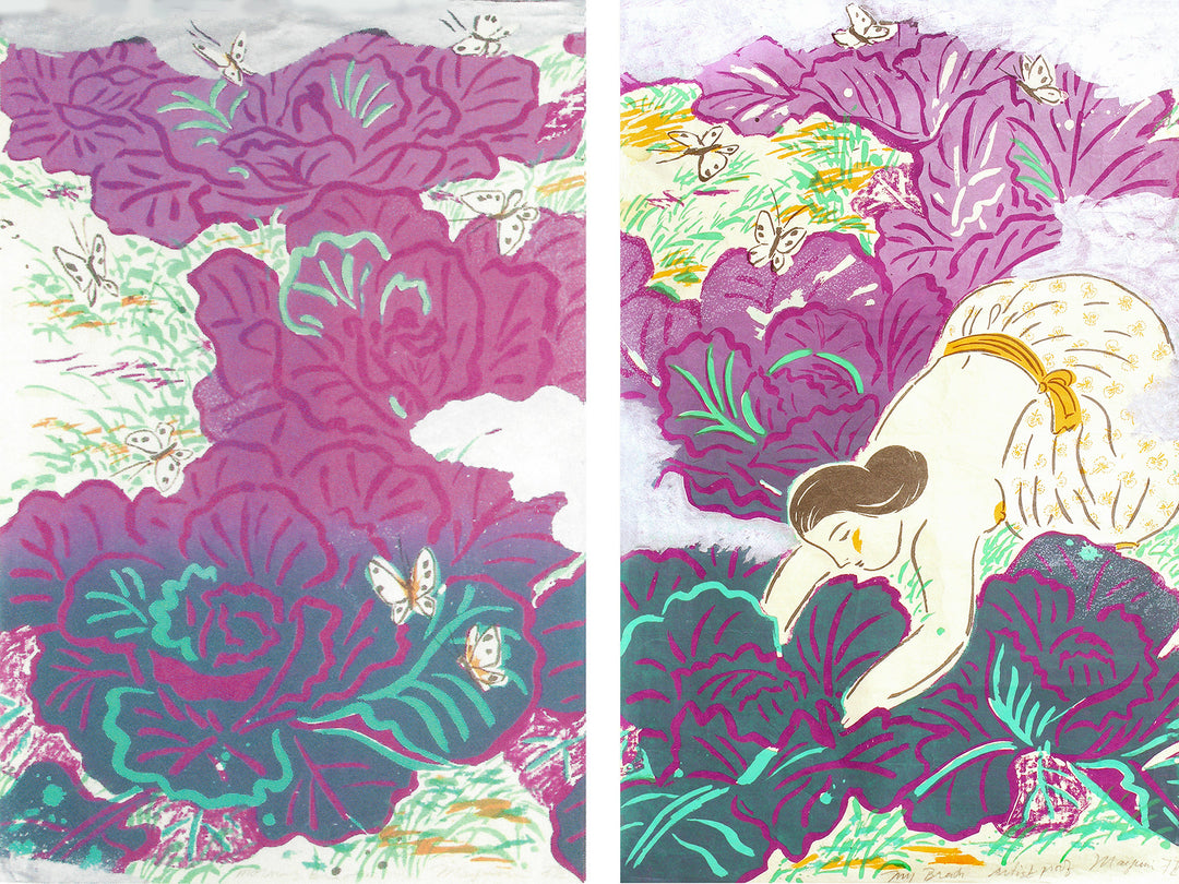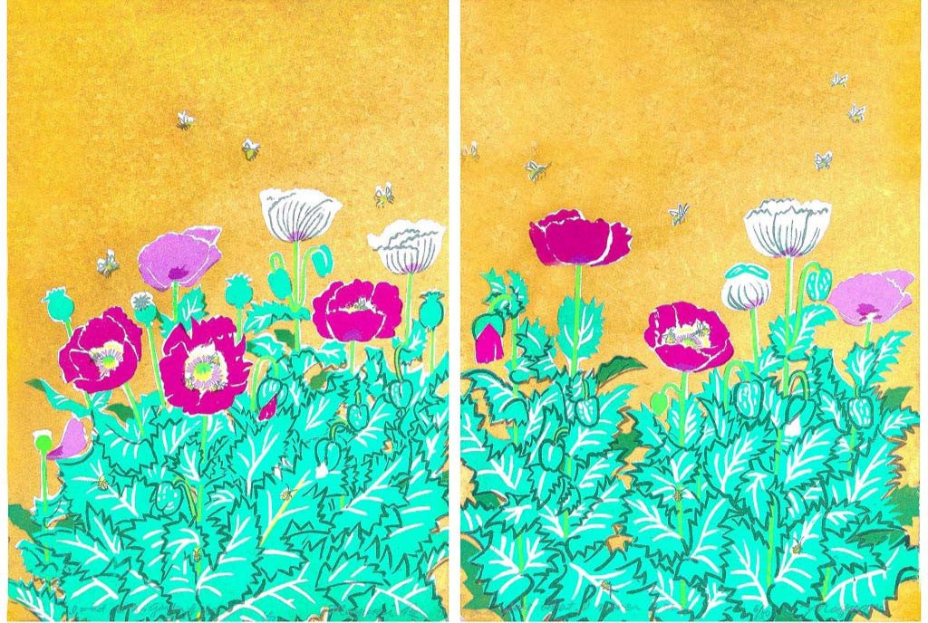 I love the Rimpa tradition of Japanese art. I wanted my garden to be painted in the style of Sotatsu and Korin. I love the challenge & technical difficulty of aligning the images. As there was no gold or silver ink, to make the gold & silver backgrounds, special powder was mixed into the paint.
